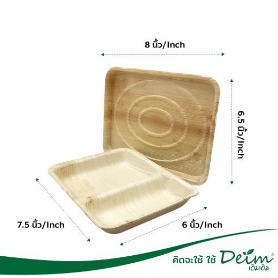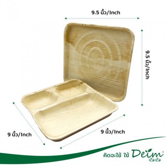 ชุดกล่องข้าวเบนโตะแบบ 2 หลุมและ 3 หลุม พร้อมฝาปิด ผลิตจากกาบหมาก ซึ่งเป็นวัตถุดิบที่มาจากธรรมชาติ 100% ปราศจากสารเคมีและการฟอกสี เป็นมิตรต่อสิ่งแวดล้อม ไม่แตกหักง่าย ย่อยสลายได้เองใน 45 วัน ปลอดภัยเพราะผ่านการฆ่าเชื้อด้วยแสง UV