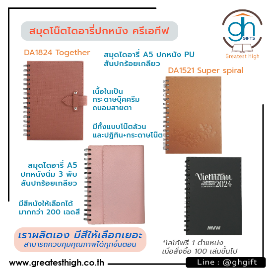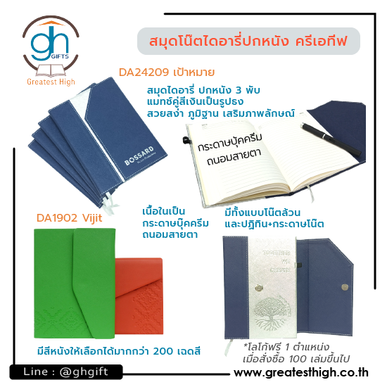 มอบสมุดโน๊ตไดอารี่ปกหนัง มอบสมุดโน๊ตออแกไนเซอร์ปกหนัง สันสันสวยในดีไซน์ขนาดต่างๆ เพื่อเป็นของที่ระลึกในวาระครบรอบ ของขวัญของชำร่วยขึ้นปีใหม่ สำหรับมอบแด่ลูกค้า แขกผู้มีเกียรติและบุคคลสำคัญ ภายใต้ดีไซน์สวยดูภูมิฐานหรือดีไซน์ที่มีเอกลักษณ์เข้ากับธีมของแบรนด์ บ่งบอกความเป็นเอกลักษณ์ให้กับองค์กร