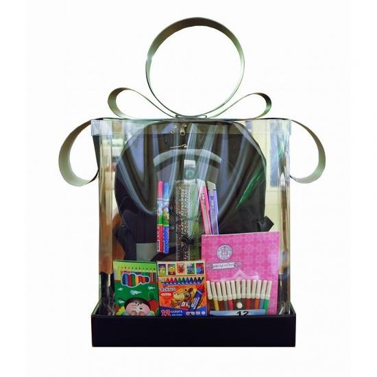 ภายในบรรจุอุปกรณ์การศึกษา เช่น กระเป๋าเป้ ดินสอไม้บรรทัด ยางลบ กาวน้ำสีเทียน คัตเตอร์ เป็นต้น