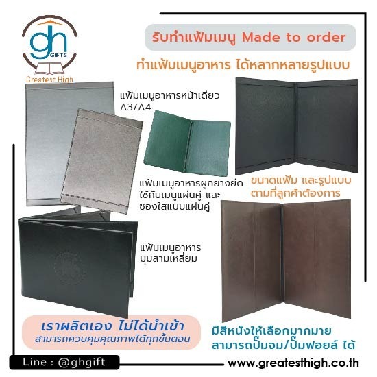 เรารับผลิตปกเมนู ตามแบบลูกค้า (made to order) ท่านสามารถกำหนดขนาดและรูปแบบของปกเมนูหนังเทียมได้เอง  ด้วยจำนวนขั้นต่ำเริ่มต้นแค่ 20 เล่มเท่านั้น พร้อมบริการทำโลโก้ เพื่อให้เมนูของท่านโดดเด่น ดูมีราคา สามารถสร้างภาพลักษณ์ให้ร้านอาหารของท่านได้