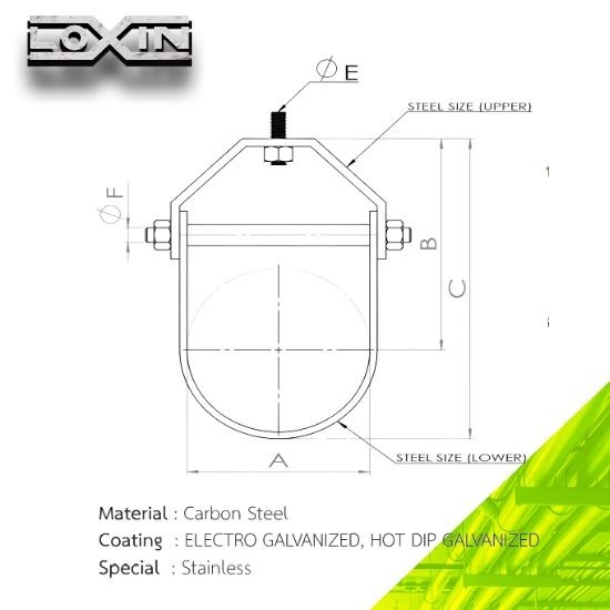 เป็นอุปกรณ์แขวนท่อ (Pipe Hanger) หรือแคล้มแขวนท่อมีรูปร่างหลายแบบ รูปส้มโอ นิยมนำมาใช้ เป็นแคล้มแขวนท่อหลากหลายชนิด ผลิตจากเหล็ก (Carboon Steel) ชุบ(รุ้ง) ซิงค์หนา (ELECTRO GALANIZED) เพื่อการใช้งานในระบบที่เหมาะสม แข็งแรง ทนทาน มีคลิปล็อค บนสลักเกลียว เพื่อไม่ให้น๊อตหลุด มีหลายขนาดให้เลือก สามารถรับน้ำหนักบรรทุกได้สูงสุด 16 กก. ติดตั้งง่าย ประหยัดเวลาง่าย ต่อการทำงาน