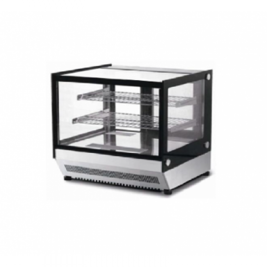 Square glass cake freezer, 2-tier glass, evaporating tray, 3-tier shelf plus base, has a heater pad on the glass to prevent fogging, LED light inside the cabinet. And has casters, easy to move, power 220V, 50Hz, 2.3A, 506W, power 220V, 50Hz, 2.5A, temperature 2 to 10 degrees Celsius, refrigerant R290/90, guarantees cooling 1 year, 1 year compressor warranty, weight 141 kg.
