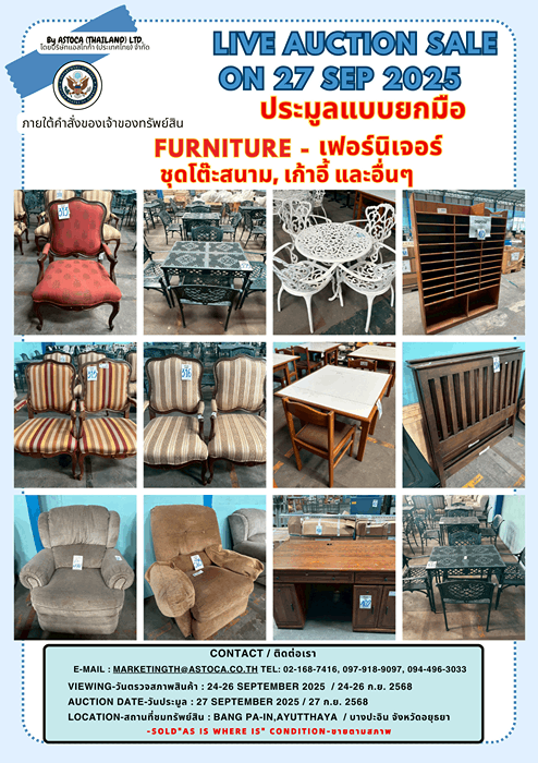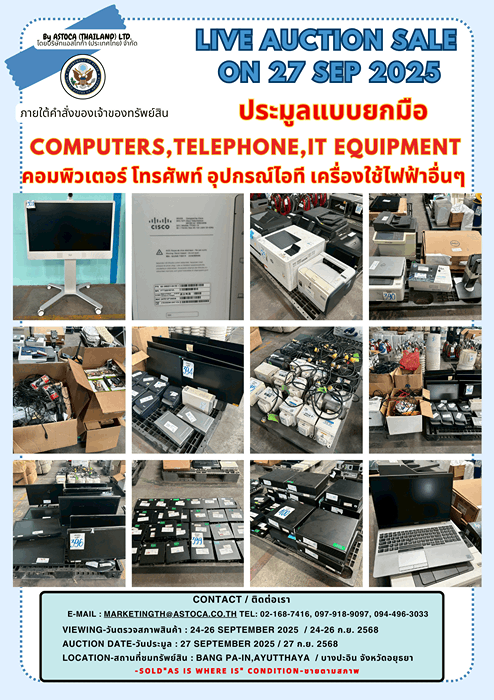 การจัดการขายเครื่องจักรอุตสาหกรรม, เฟอร์นิเจอร์, ยานพาหนะ, อุปกรณ์ไอที, เครื่องใช้ไฟฟ้า และอื่นๆอีกมากมายหลายประเภท การประเมินราคาทรัพย์สินอย่างถูกต้อง และได้ผลตอบแทนสูงสุดในทรัพย์สินของคุณ ในต้นทุนที่ต่ำ