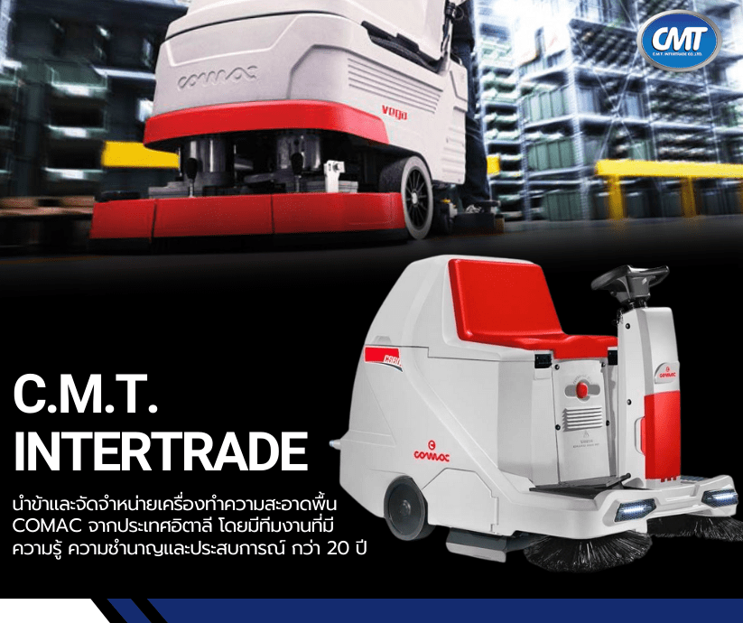 บริษัท ซี.เอ็ม.ที.อินเตอร์เทรด จำกัด นำข้าและจัดจำหน่ายเครื่องทำความสะอาดพื้น COMAC จากประเทศอิตาลี เหมาะสำหรับ โรงงานอุตสาหกรรม คลังสินค้า โกดังสินค้า โรงซ่อม โชว์รูมรถยนต์ โรงเรียน โรงแรม โรงพยาบาล ห้างสรรพสินค้า สนามบิน  โดยมีทีมงานที่มีความรู้ ความชำนาญและประสบการณ์ กว่า 20 ปี