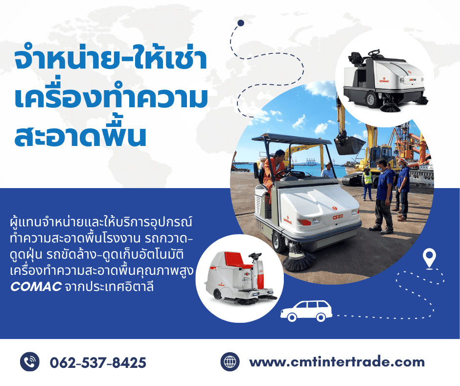 บริษัท ซี.เอ็ม.ที.อินเตอร์เทรด จำกัด นำข้าและจัดจำหน่ายเครื่องทำความสะอาดพื้น COMAC จากประเทศอิตาลี อีกทั้งยังมีสินค้าเครื่องทำความสะอาดพื้นภายใต้แบรนด์ C.M.T การใช้งานเหมาะสำหรับ โรงงานอุตสาหกรรม โรงพยาบาล ห้างสรรพสินค้า โดยเราเป็นศูนย์รวมเครื่องทำความสะอาดพื้นแบบครบวงจร มีสินค้าหลากหลายประเภท หลายหลายรุ่นใช้งานตามความต้องการของลูกค้า สินค้าทุกชิ้นมีประกันหลังการขาย ผลิตภัณฑ์ของเรา อาทิ เช่น เครื่องขัดพื้น เครื่องขัดล้างพื้นดูดน้ำอัตโนมัติ รถขัดพื้น เครื่องกวาดพื้นรถกวาดพื้นดูดฝุ่น รถดูดฝุ่น รถกวาดถนน เครื่องดูดฝุ่นดูดน้ำอุตสาหกรรม โดยทางบริษัทให้ความสำคัญกับลูกค้าด้านการบริการเป็นอย่างมาก เรายินดีให้คำปรึกษาและแนะนำสินค้าให้ตรงโจทย์การใช้งานได้เป็นอย่างดี ทั้งบริการให้เช่า รายเดือน รายปี และจัดจำหน่าย พร้อมการดูแลหลังการใช้บริการ เช่น ตรวจเช็คสภาพเพื่อบำรุงรักษา ซ่อมแซมเปลี่ยนอะไหล่ โดยทีมงานที่มีความรู้ความชำนาญเฉพาะทาง ประสบการณ์การทำงานอย่างมืออาชีพ