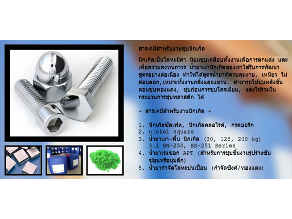 จำหน่ายเคมีภัณฑ์ชุบโลหะ เคมีภัณฑ์สำหรับอุตสาหกรรม เพื่อการชุบ เช่น เคมีภัณฑ์ สารเคมีสำหรับงานชุบนิกเกิล เคมีชุบทองแดง หรือ น้ำยาชุบทองแดง สารเคมีชุบซิงค์ เคมีเคลือบผิวหลังชุบ สารเคมีสำหรับเตรียมผิว