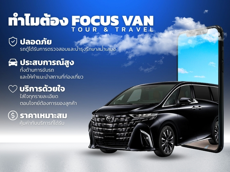 บริการเช่ารถตู้ VIP เที่ยวภูเก็ต… เกาะสวรรค์แห่งทะเลและธรรมชาติอันงดงาม บริการ เช่ารถตู้ VIP พร้อมคนขับมืออาชีพ ให้ทุกการเดินทางของคุณเต็มไปด้วยความสะดวกสบายและรอยยิ้มกับ Focus Van Tour & Travel เราพร้อมสร้างประสบการณ์เดินทางที่อบอุ่น น่ารัก และประทับใจ รถตู้วีไอพี ตกแต่งภายในหรูหรา พร้อมมอบประสบการณ์การเดินทางที่ปลอดภัย สะดวกสบาย เติมเต็มทุกการเดินทางทั่วภูเก็ต ภูเก็ต จังหวัดท่องเที่ยวชื่อดังของภาคใต้ที่ขึ้นชื่อทั้ง ทะเลใส หาดทรายขาว ป่าเขา และอุทยานธรรมชาติ เหมาะกับนักท่องเที่ยวที่อยากพักผ่อนใกล้ชิดธรรมชาติ ทั้งการเล่นน้ำทะเล ดำน้ำ ดูปะการัง และเดินป่าศึกษาธรรมชาติ เริ่มต้นวันด้วยการเยี่ยมชม หาดป่าตอง, หาดกะรน, หรือ หาดกมลา ชายหาดสวย น้ำใส และบรรยากาศสดชื่น เหมาะกับการนั่งเล่น พักผ่อน หรือทำกิจกรรมทางน้ำ สำหรับสายผจญภัย แนะนำ อุทยานแห่งชาติสิรินาถ และ เขาหลัก-ภูเก็ต ที่มีป่าเขาเขียวขจี เส้นทางเดินป่า น้ำตก และจุดชมวิวสุดอลังการ สามารถชมทะเลและเกาะเล็กเกาะน้อยรอบ ๆ ได้อย่างเต็มตา นอกจากนี้ยังมี เกาะเฮ และ เกาะราชา ซึ่งเป็นเกาะใกล้ภูเก็ตที่น้ำทะเลใส เหมาะกับการดำน้ำดูปะการังหรือพักผ่อนอย่างสงบ สายด่วน Focus Van Tour & Travel : 081-938-4764