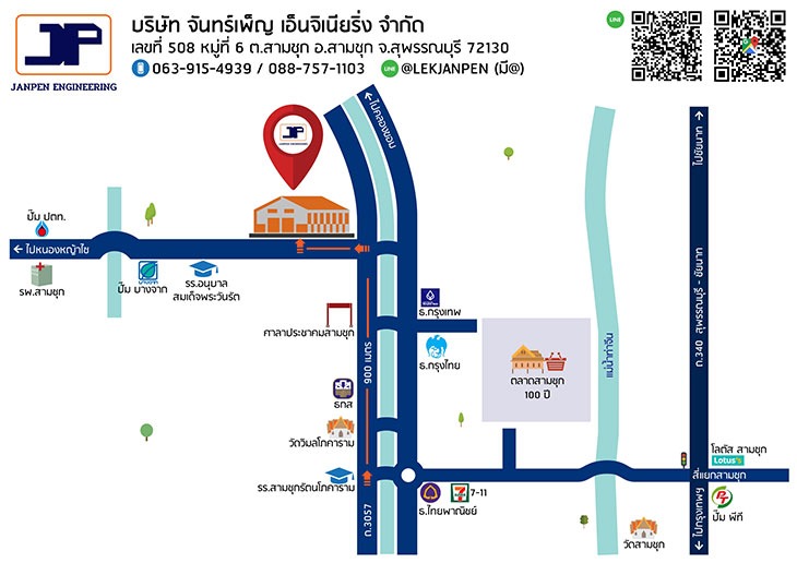 เดินทางจากแยกสามชุกเลี้ยวซ้ายสังเกตหน้าโรงเรียนสามชุกรัตนโภคารามเลี้ยวขวา วิ่งเลียบคลองประมาณ 900 เมตร เลี้ยวซ้ายเห็นร้านเหล็กจันทร์เพ็ญ เอ็นจิเนียริ่ง สุพรรณบุรี ตรงหัวมุม เดินทางมาที่ร้านด้วยแผนที่ Google Map พิกัด 14.758534,100.089169