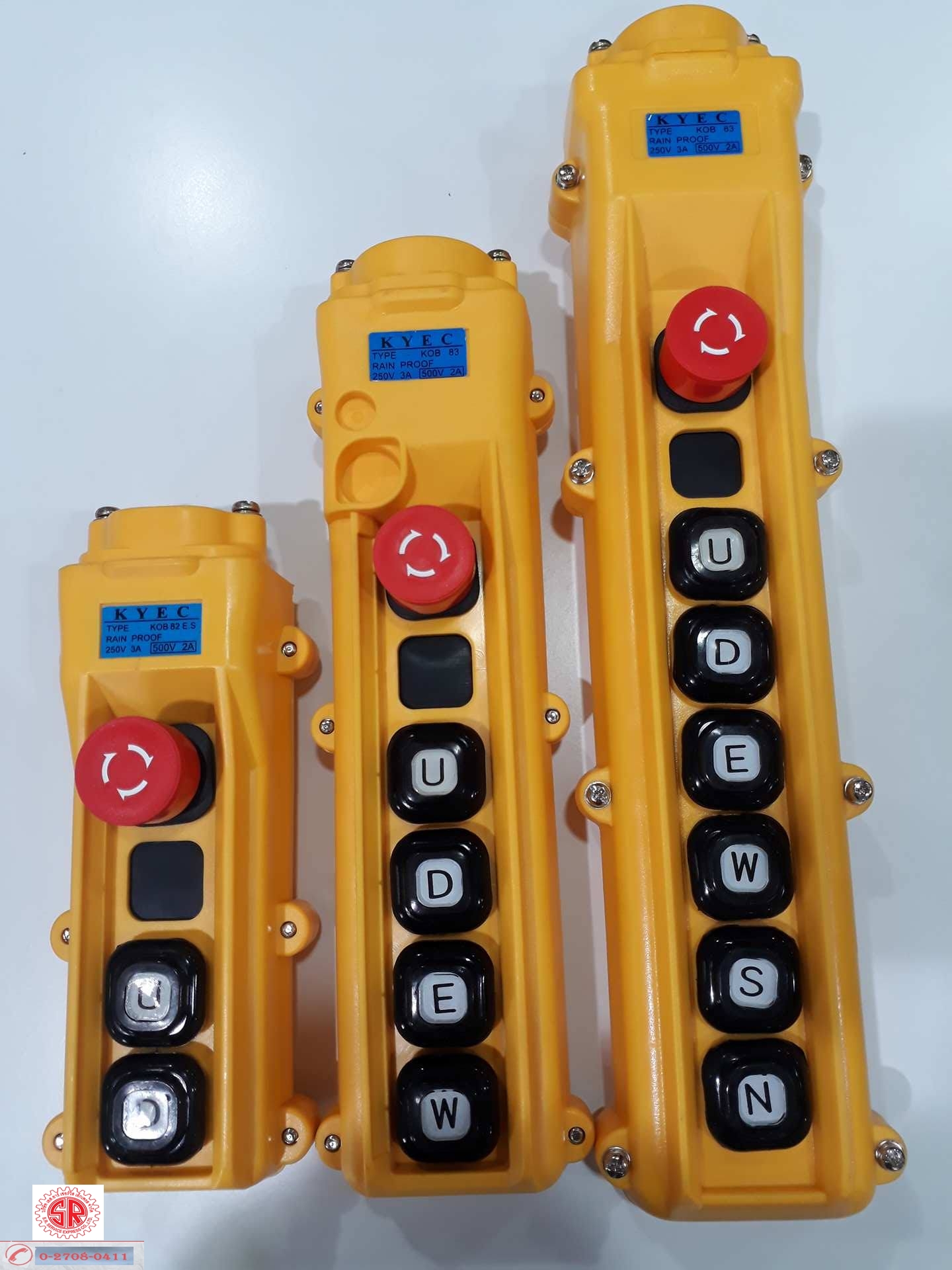 • ขายอุปกรณ์ไฟฟ้าเครน อุปกรณ์รางซีเรล (C-Rail systems), สายไฮโทรริว 75A 100A ตัวจับสายไฮโทรริว อุปกรณ์ชุดตัวดึงหัว-ท้าย สายไฟแบน สายไฟกลมมีสลิง ตัวจับ ตัวต่อ แปรงถ่าน, ระบบควบคุมรอกเครน Control Pendant, รีโมทเครน (Telecrane) สวิทช์เครน KASUGA แบบ 1สปีด และ 2สปีด รุ่น 2ปุ่ม, 4ปุ่ม, 6ปุ่ม จากญี่ปุ่น, 8ปุ่ม แบบ Emergency, แบบ ON-OFF จากญี่ปุ่น, สวิทช์เครน (Switch KYEC) จากใต้หวัน