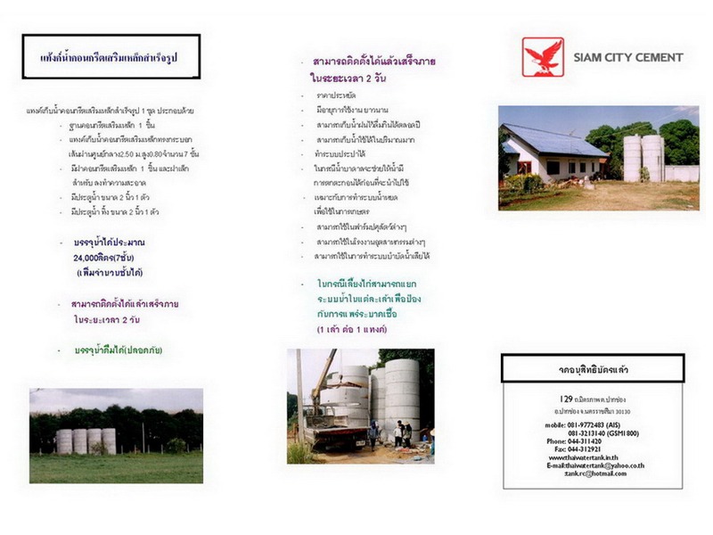 - ถังเก็บน้ำคอนกรีตสำเร็จ เป็น ถังเก็บน้ำขนาดใหญ่ ใช้บรรจุน้ำดื่มได้อย่างปลอดภัย ทำระบบประปาได้